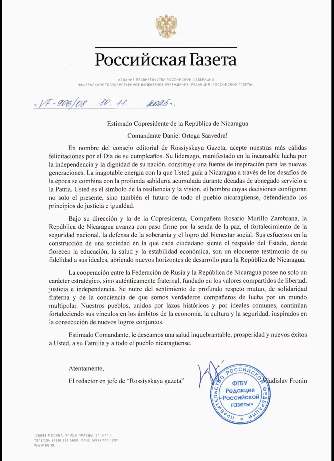 El Consejo Editorial del Diario Ruso Rossiyskaya Gazeta envió un mensaje de felicitación al Comandante Daniel Ortega Saavedra con motivo de su cumpleaños, reconociendo su liderazgo y destacando los lazos de amistad, respeto y cooperación entre Rusia y Nicaragua.