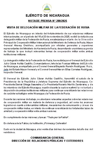 El Ejército de Nicaragua, en el marco del fortalecimiento de sus relaciones internacionales, recibió del 16 al 20 de noviembre de 2025 la visita oficial de una delegación militar de la Federación de Rusia, encabezada por el Mayor General Alexey Orekhov.
