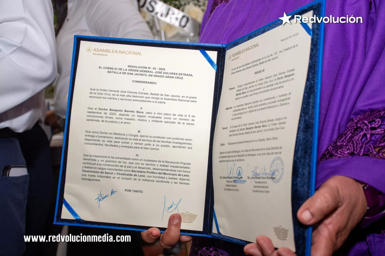 Del mismo modo se realizó la lectura del Diploma de la Orden General José Dolores Estrada, Batalla de San Jacinto, en Grado Gran Cruz, a cargo de la diputada Loria Raquel Dixon Brautigam, Primera Secretaria de la Asamblea Nacional. Esta alta distinción reconoce el heroísmo cívico y patriótico del Dr. Barreto Baca, su fidelidad a la defensa de la soberanía nacional y al legado histórico de nuestros héroes y mártires.