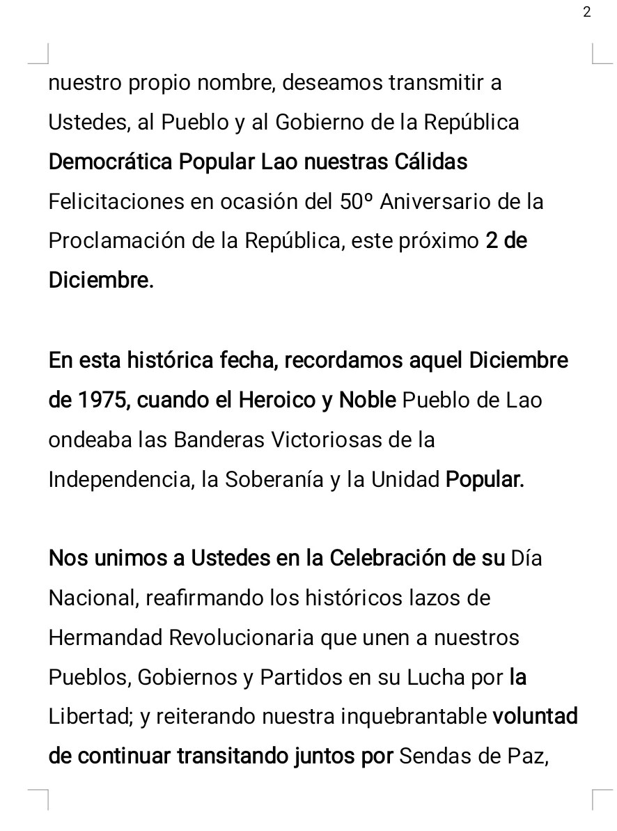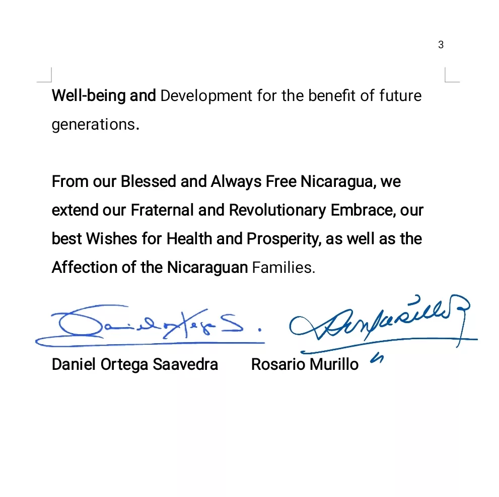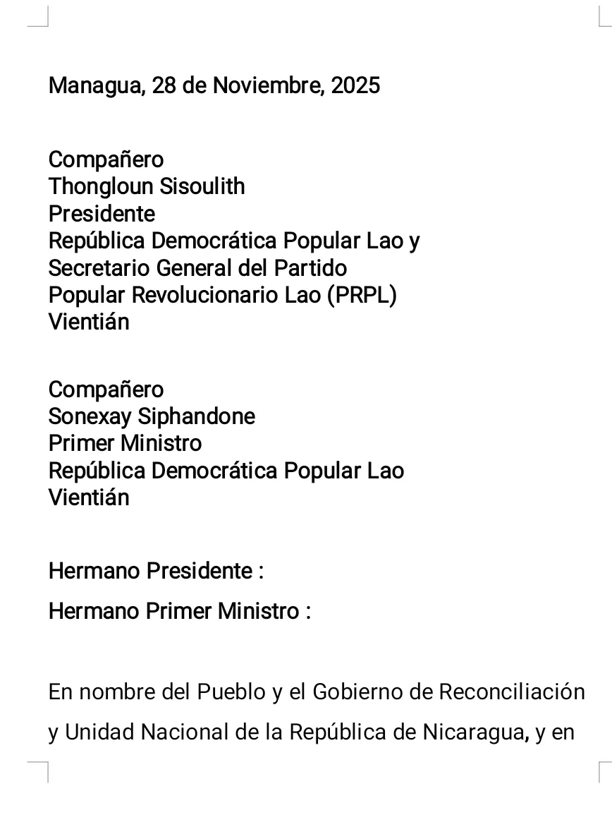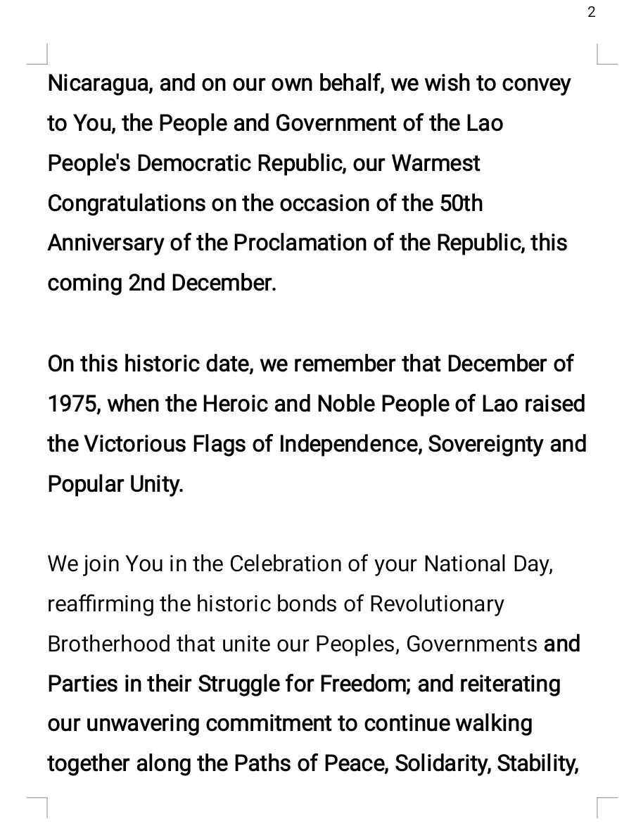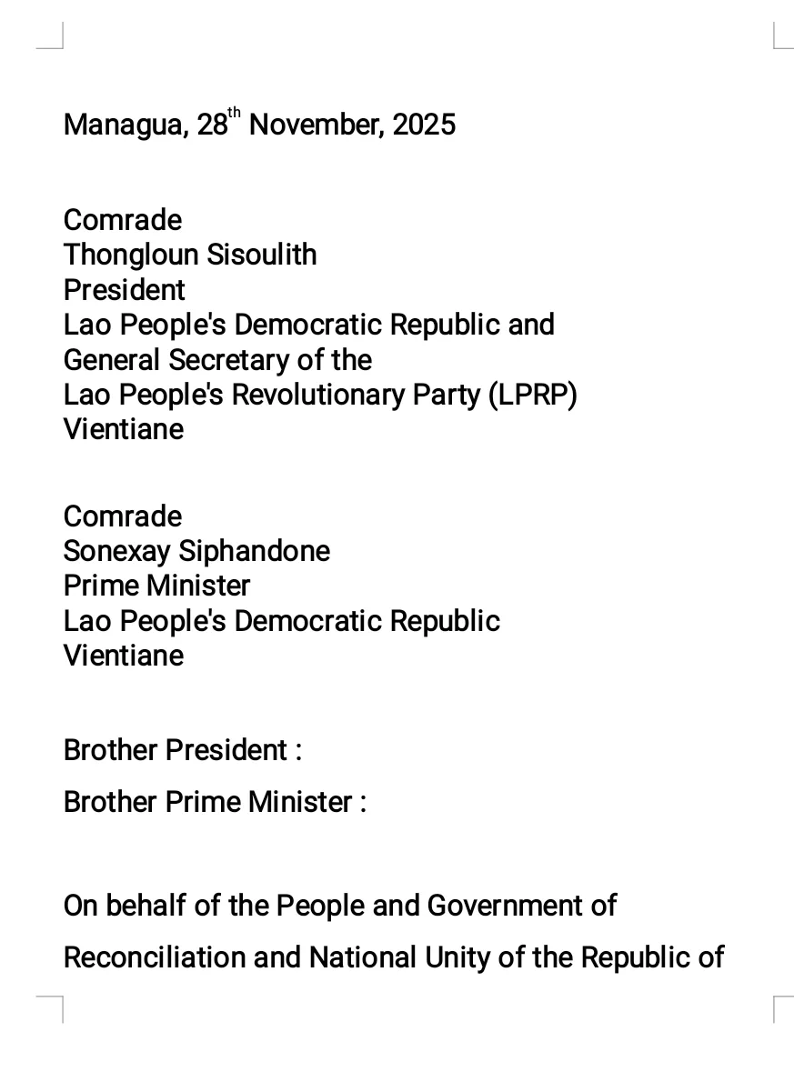 Nicaragua transmitió un mensaje de felicitación a la República Democrática Popular Lao, reafirmando los sólidos vínculos de amistad.