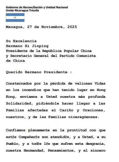 El Gobierno de Nicaragua manifestó su profunda solidaridad con el pueblo y las autoridades de Hong Kong tras los recientes incendios que provocaron la irreparable pérdida de vidas humanas. En su mensaje, reiteró su acompañamiento en este momento de dolor y lamentó profundamente la tragedia que ha conmovido a la comunidad internacional.