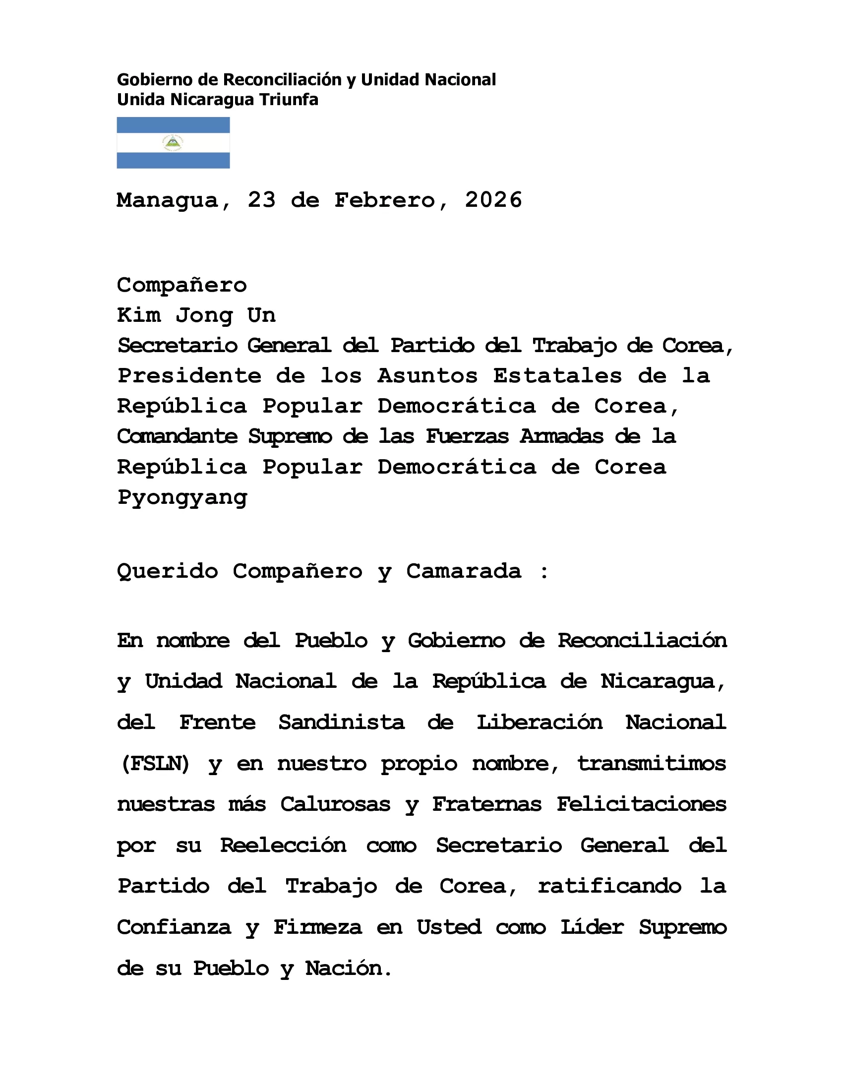 En nombre del Pueblo y Gobierno de Reconciliación y Unidad Nacional de la República de Nicaragua, del Frente Sandinista de Liberación Nacional (FSLN) y en nuestro propio nombre, transmitimos nuestras más Calurosas y Fraternas Felicitaciones por su Reelección como Secretario General del Partido del Trabajo de Corea, ratificando la Confianza y Firmeza en Usted como Líder Supremo de su Pueblo y Nación.