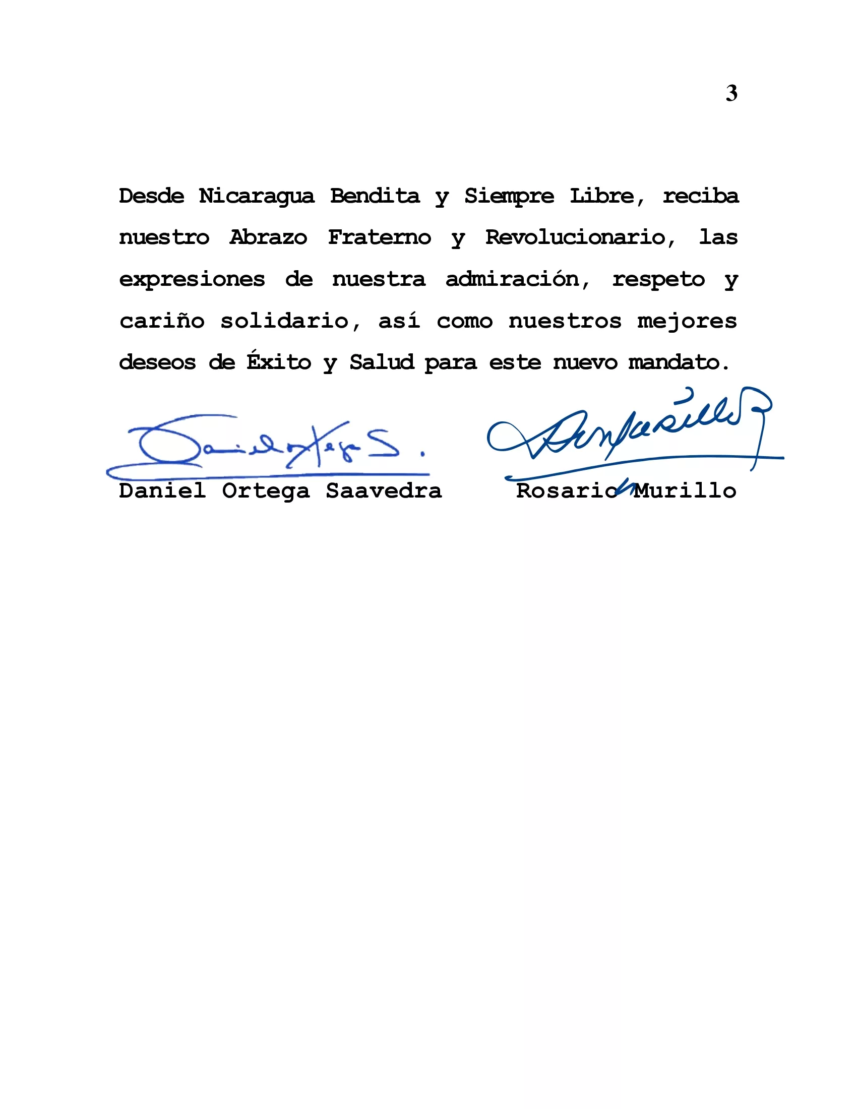 From Blessed and Always Free Nicaragua, please receive our Fraternal and Revolutionary Embrace, the assurances of our admiration, respect and solidarity, as well as our best wishes for Success and Health for this new mandate.