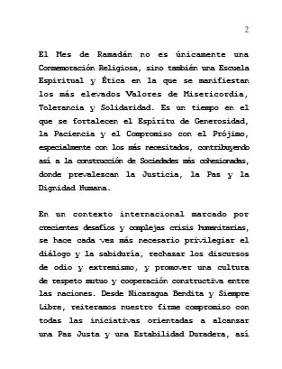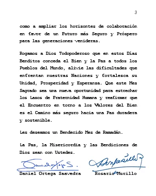 Partiendo de los Valores Humanos que unen a los Pueblos más allá de sus Credos y Culturas, y convencidos de que la diversidad religiosa y cultural constituye una fuente de riqueza para nuestra Unidad Humana compartida, nos complace, en nombre del Pueblo y del Gobierno de Reconciliación y Unidad Nacional de la República de Nicaragua, y en el nuestro, expresarles nuestros más sinceras Felicitaciones y mejores Deseos con motivo del Sagrado Mes de Ramadán.