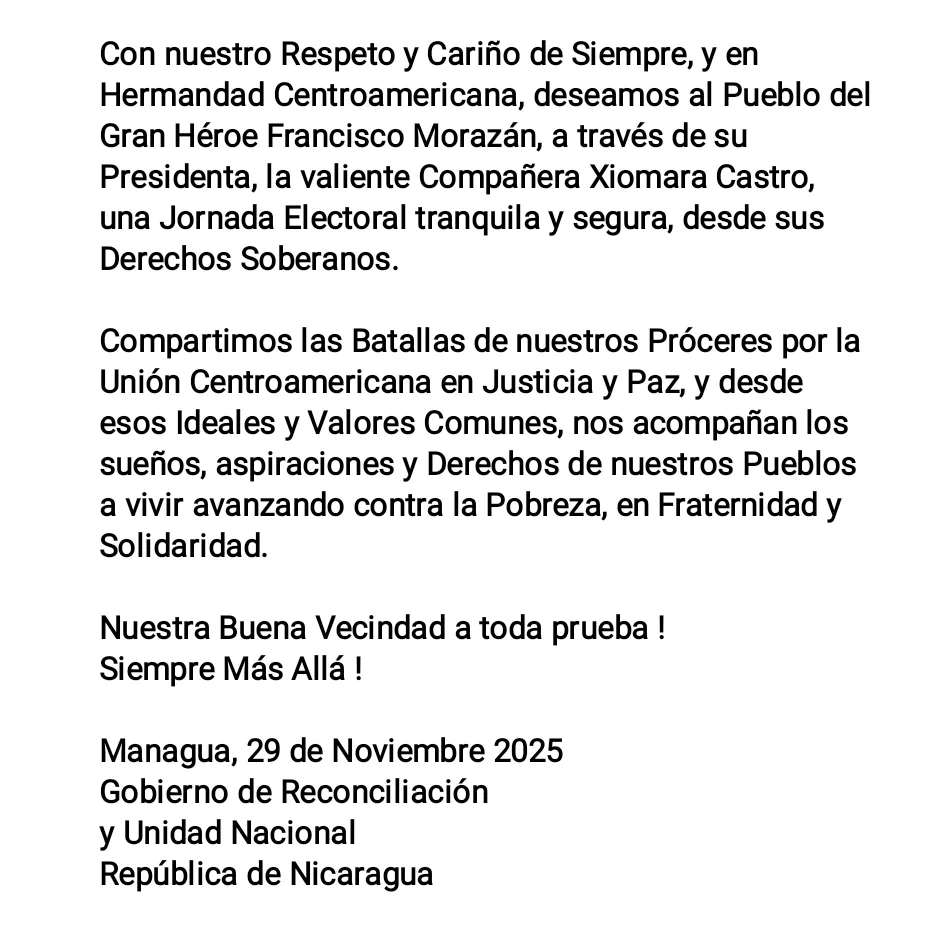 El Gobierno de Reconciliación y Unidad Nacional de Nicaragua transmitió un saludo fraterno al Pueblo y Gobierno de Honduras, expresando sus mejores deseos en la Jornada Electoral.
