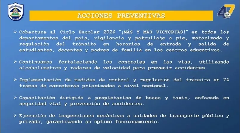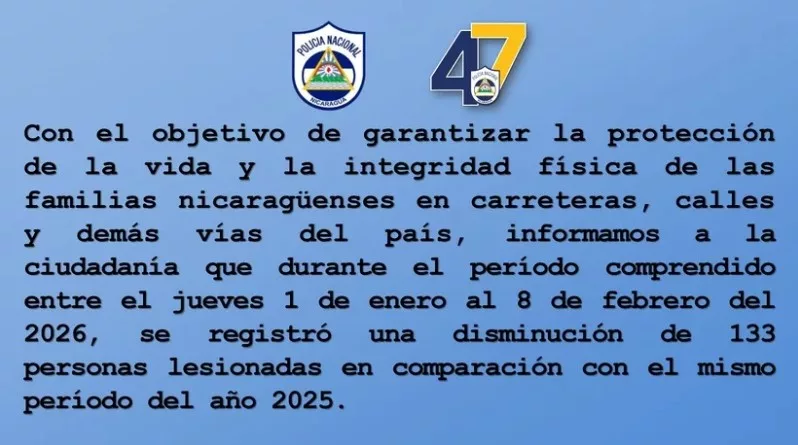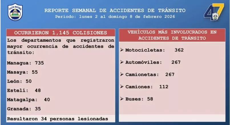 La Policía Nacional informó, en conferencia de prensa, que del 1 al 8 de febrero de 2026 se registraron 1,145 colisiones de tránsito a nivel nacional, reflejando una disminución en el número de personas lesionadas en comparación con el mismo período del año anterior, como resultado de las acciones preventivas y de educación vial.