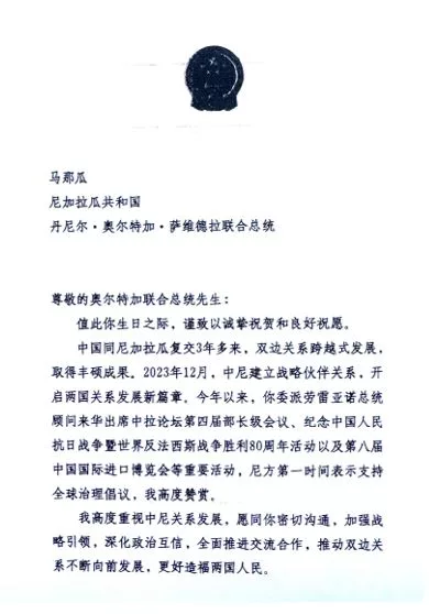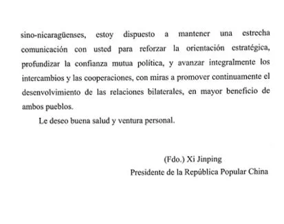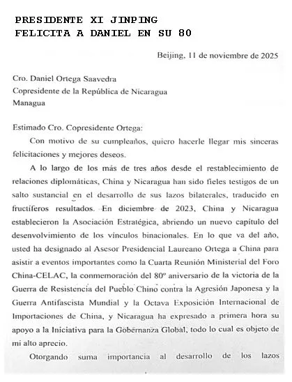 El Presidente de la República Popular China, Xi Jinping, envió un cálido mensaje de felicitación al Comandante Daniel Ortega Saavedra con motivo de su cumpleaños, expresando sus mejores deseos de salud y bienestar, y reafirmando los lazos de amistad, cooperación y solidaridad que unen a China y Nicaragua.