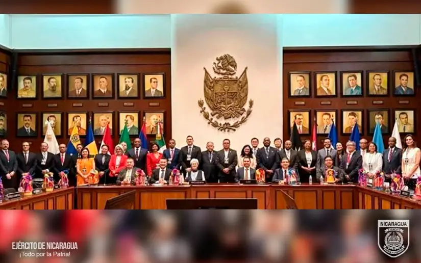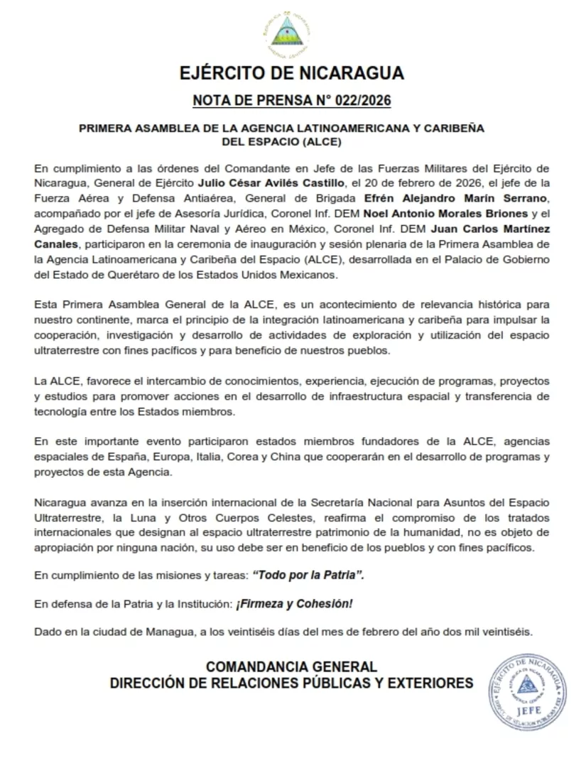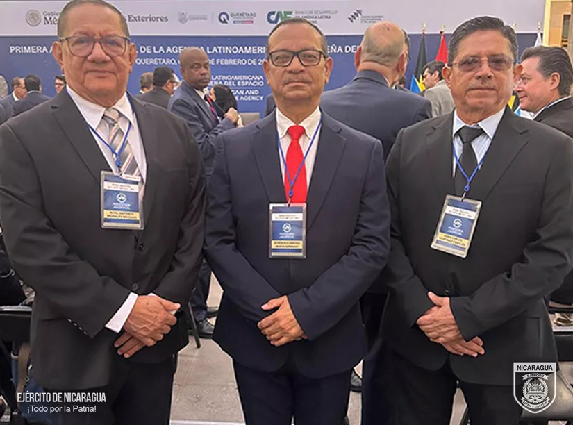 En cumplimiento a las órdenes del Comandante en Jefe de las Fuerzas Militares del Ejército de Nicaragua, General de Ejército Julio César Avilés Castillo, el 20 de febrero de 2026, el jefe de la Fuerza Aérea y Defensa Antiaérea, General de Brigada Efrén Alejandro Marín Serrano, acompañado por el jefe de Asesoría Jurídica, Coronel Inf. DEM Noel Antonio Morales Briones y el Agregado de Defensa Militar Naval y Aéreo en México, Coronel Inf. DEM Juan Carlos Martínez Canales, participaron en la ceremonia de inauguración y sesión plenaria de la Primera Asamblea de la Agencia Latinoamericana y Caribeña del Espacio (ALCE), desarrollada en el Palacio de Gobierno del Estado de Querétaro de los Estados Unidos Mexicanos.