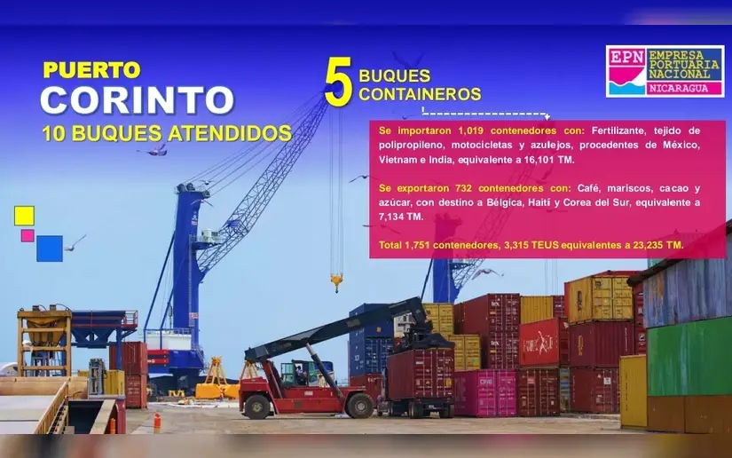 En Corinto se movilizaron 1.751 contenedores, que transportaron productos por 23.235 toneladas, explicó Aburto. Además, se recibieron 3 buques tanqueros que importaron 16.529 toneladas métricas de diésel y 4.735 de gasolina, para un total de carga de combustible de 21.264 toneladas métricas, y se importaron 293 vehículos nuevos provenientes de Indonesia, China, México y Japón.