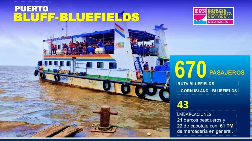 En el Puerto El Bluff-Bluefields se atendieron 43 embarcaciones nacionales, de las cuales 21 son barcos pesqueros y 22 de cabotaje que movilizaron 61 toneladas métricas de mercadería en general. Igualmente, se atendieron 670 pasajeros en la ruta Bluefields-Corn Island-Bluefields.