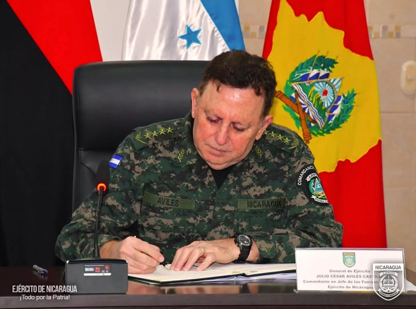El día 8 de noviembre del año 2025, se llevó a cabo en formato virtual Reunión de Trabajo entre el General de Ejército JULIO CÉSAR AVILÉS CASTILLO, Comandante en Jefe de las Fuerzas Militares del Ejército de Nicaragua y el General de División ROOSEVELT LEONEL HERNÁNDEZ AGUILAR Jefe del Estado Mayor Conjunto de las Fuerzas Armadas de Honduras, con el objetivo de continuar ampliando y fortaleciendo las relaciones de hermandad, colaboración y cooperación mutua entre ambas instituciones militares.