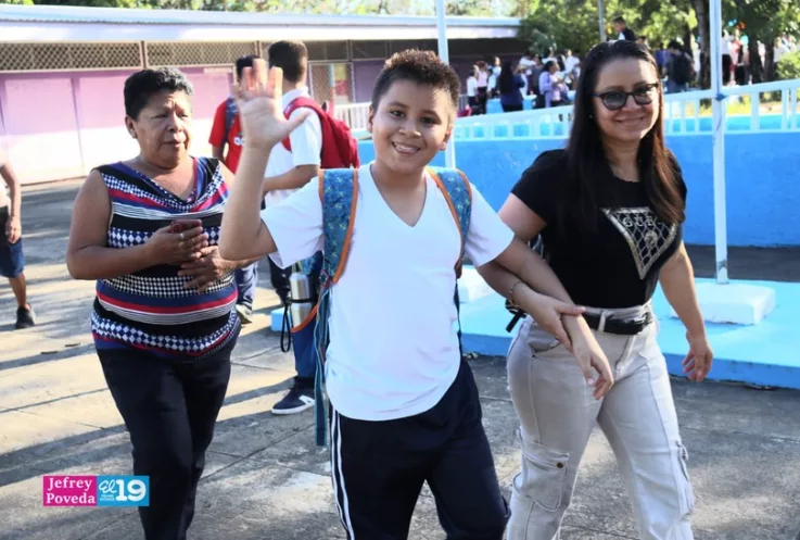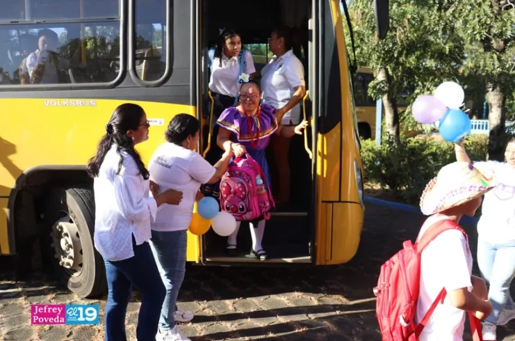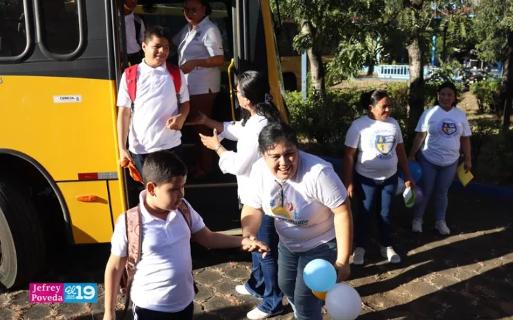 Acompañados de sus padres y tutores bajaron de las unidades de buses que los trasladan desde sus casas hasta esta Escuela, un beneficio que es garantizado por el Buen Gobierno Sandinista.