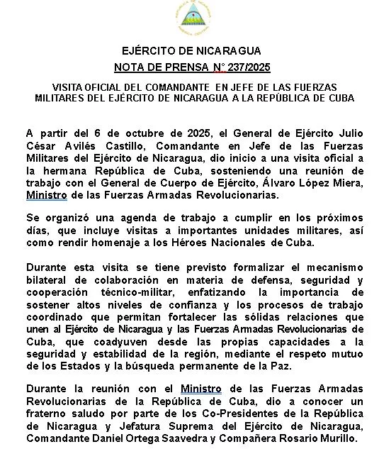 En el marco de los históricos lazos de hermandad y cooperación entre Nicaragua y Cuba, el General de Ejército Julio César Avilés Castillo, Comandante en Jefe del Ejército de Nicaragua, inició el 6 de octubre de 2025 una visita oficial a la República de Cuba.