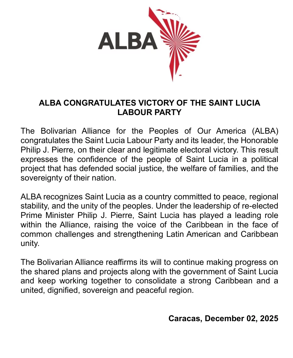 La Alianza Bolivariana para los Pueblos de Nuestra América (ALBA) extendió un mensaje de felicitación al Partido Laborista de Santa Lucía, destacando que su reciente victoria.