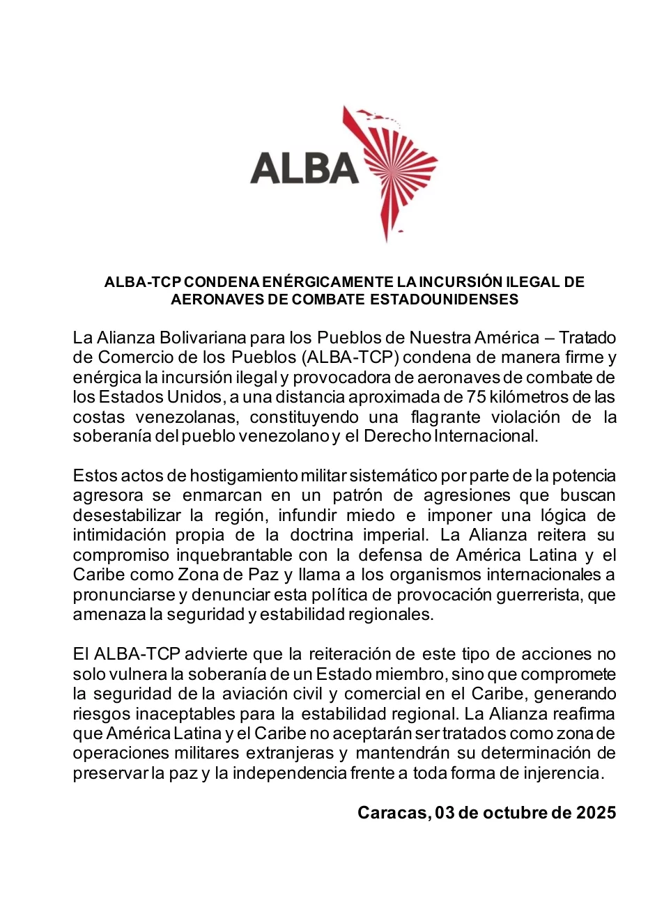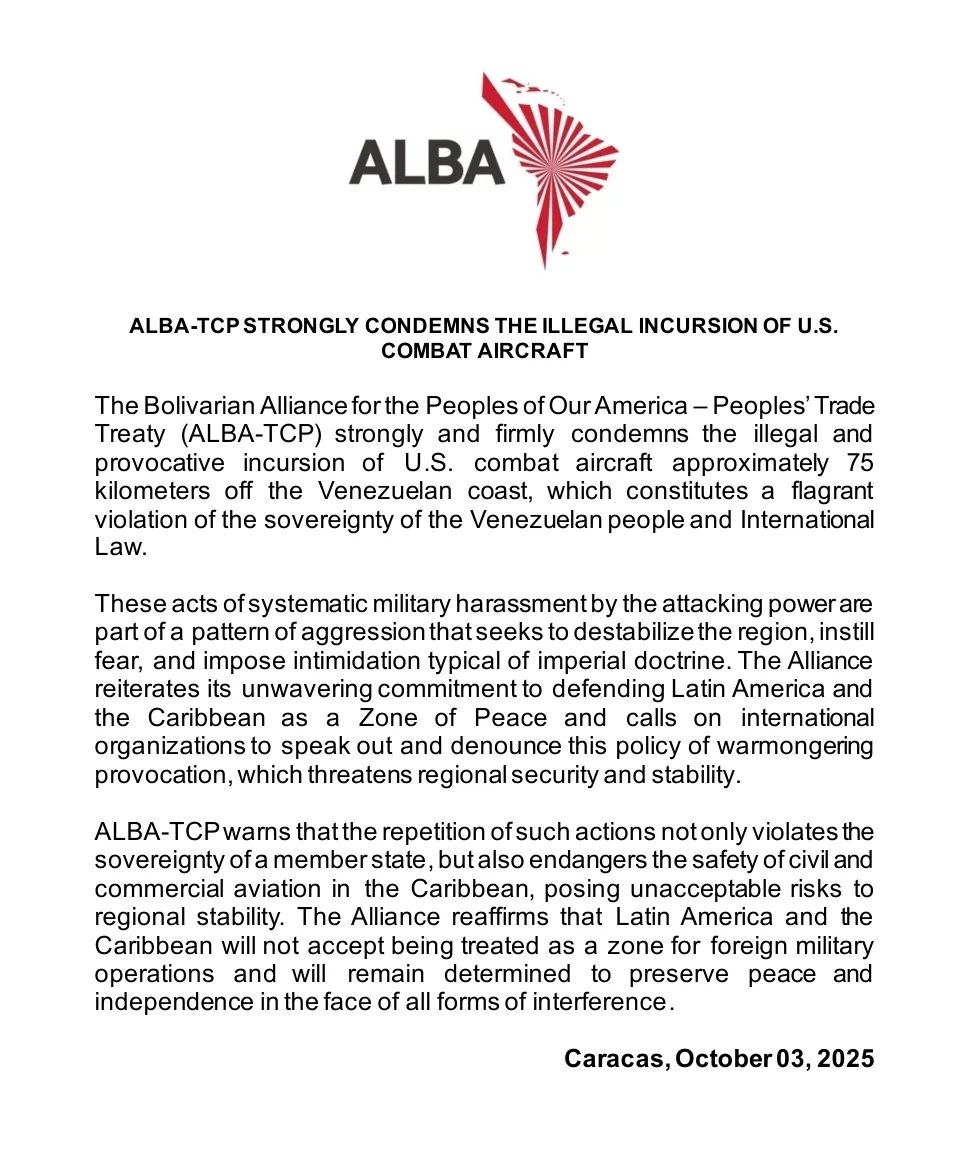 ALBA-TCP condena energéticamente la incursión ilegal de aeronaves de combate estadounidenses