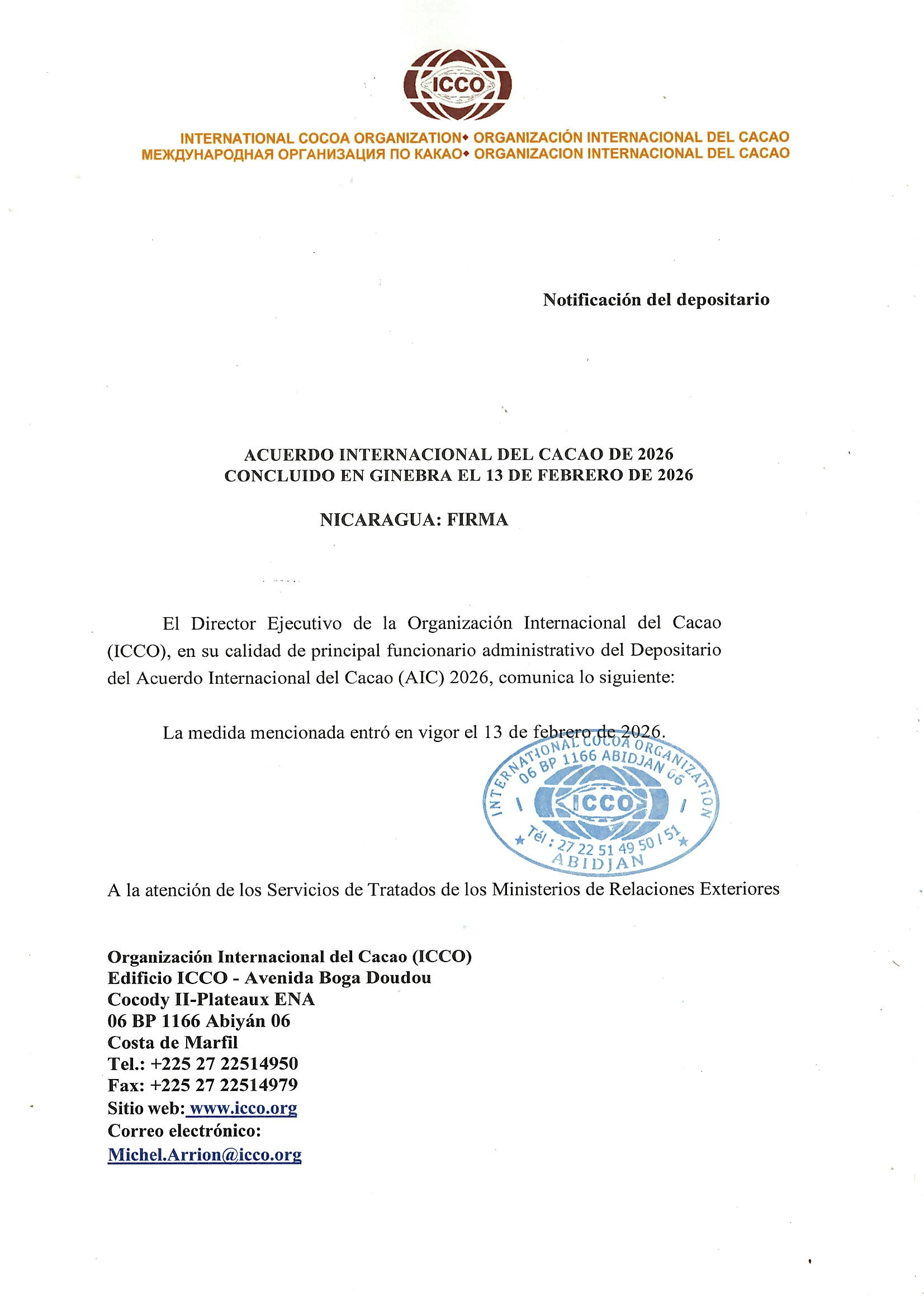 El Gobierno de Reconciliación y Unidad Nacional como parte de su compromiso con el desarrollo económico de la Nación, participó en la Conferencia de las Naciones Unidas sobre el Cacao relativa al Convenio Internacional del Cacao 2026 y en la 40ª reunión extraordinaria del Consejo de la Organización Internacional del Cacao que se realizó el Viernes 13 de Febrero en Ginebra, Suiza.