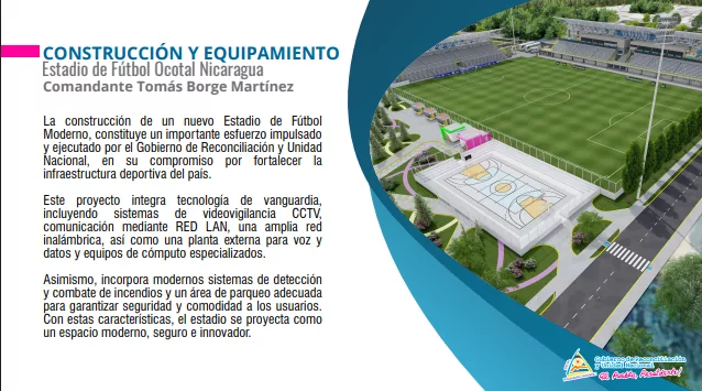 La construcción y equipamiento del Estadio de Fútbol Comandante Tomás Borge Martínez, en la ciudad de Ocotal, representa un importante avance en el fortalecimiento de la infraestructura deportiva nacional, como parte del compromiso del Gobierno de Reconciliación y Unidad Nacional con el desarrollo del deporte y la recreación en Nicaragua.