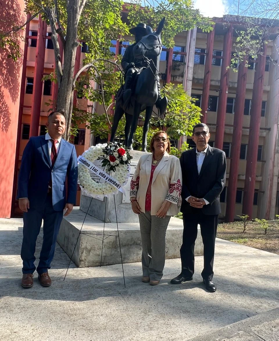 La colocación de la ofrenda floral, estuvo a cargo de nuestro Embajador, Compañero Carlos Midence, acompañado de la Vicerrectora y el representante de la Cancillería. Luego de depositar la ofrenda, el Compañero Midence, trasladó los saludos en nombre de nuestro Buen Gobierno Sandinista y Pueblo. Agradeció a quienes contribuyeron para la realización de la actividad : a las autoridades universitarias, a miembros de la solidaridad y, al Compañero David Chávez, quien remozó el Monumento.
