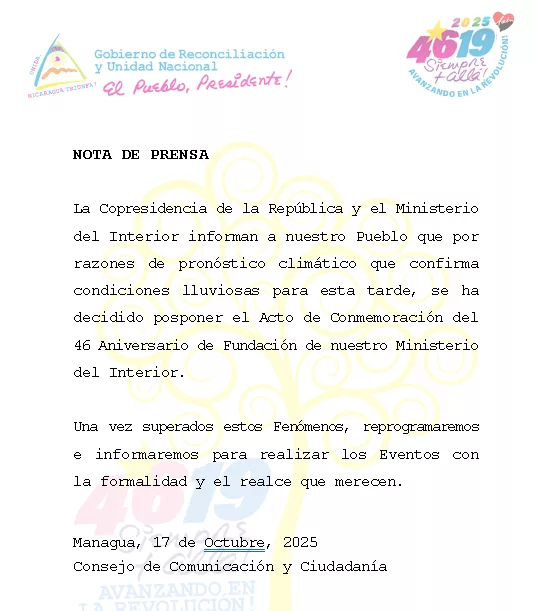 La Copresidencia de la República y el Ministerio del Interior informan a nuestro Pueblo que por razones de pronóstico climático que confirma condiciones lluviosas para esta tarde, se ha decidido posponer el Acto de Conmemoración del 46 Aniversario de Fundación de nuestro Ministerio del Interior.